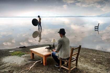 صورة جمالية لرجل مجهول الهوية في غطاء محرك السيارة