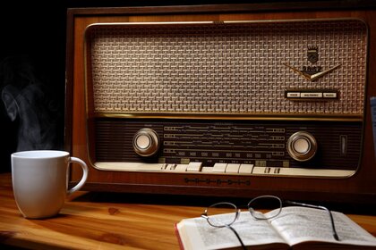 راديو ريترو خشبي بجانب القدح