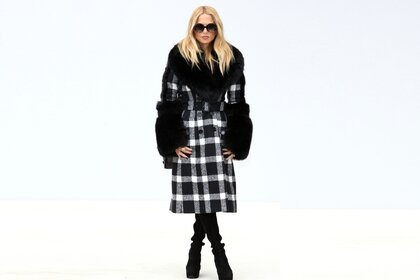نموذج في فستان الشمس الأسود والأبيض مع الكعب العالي