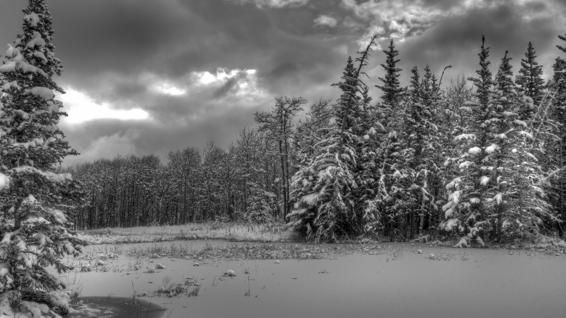 المناظر الطبيعية بالأبيض والأسود من الغابات الشتوية