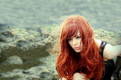 فتاة جميلة ذات شعر أحمر كثيف بجانب الماء