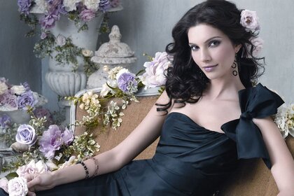 العروس مع باقات وزهرة الورد في شعرها