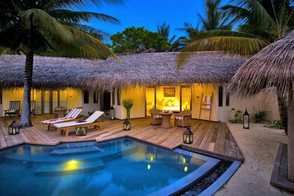 كوخ مع حمام سباحة محاط بأشجار النخيل وتوي