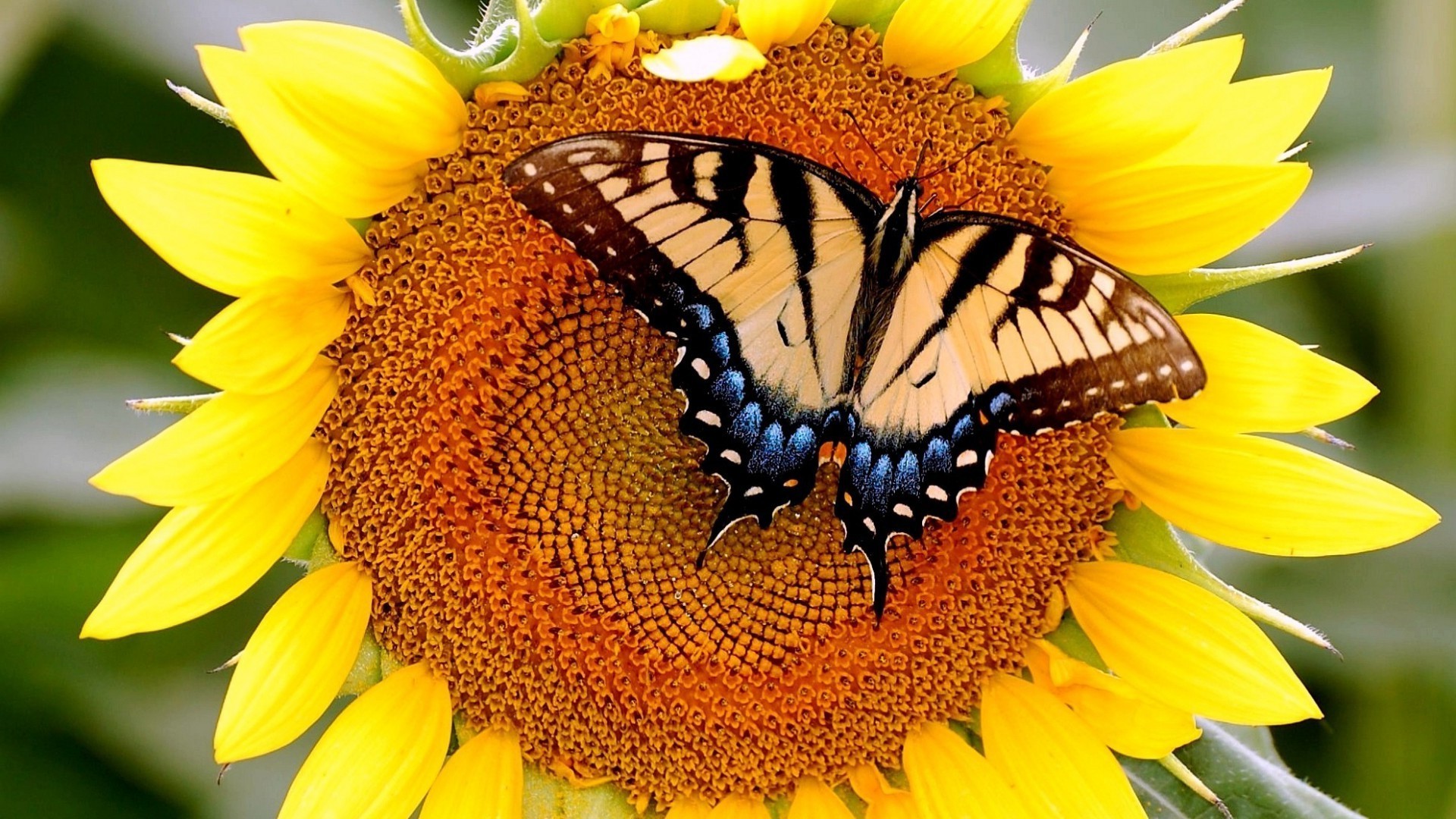 فراشة متعددة الألوان على عباد الشمس