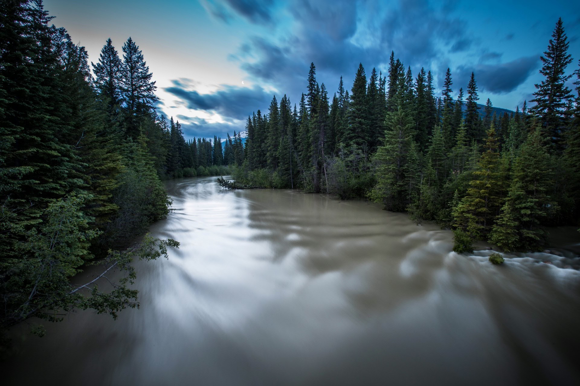 نهر بمياه موحلة في وسط غابة التنوب الخضراء