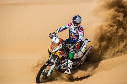 سائق دراجة نارية في الرمال الصفراء هو الغبار