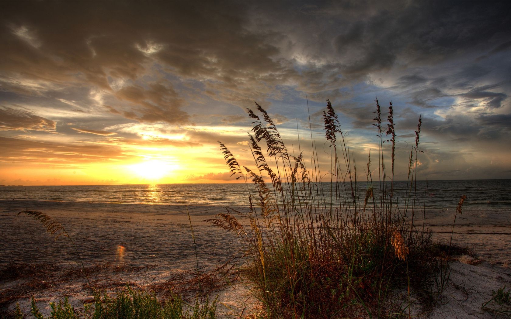 منظر طبيعي يصور غروب الشمس والشاطئ والأمواج