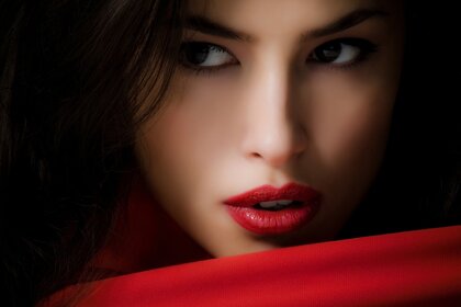 أحمر الشفاه القرمزي على شفاه الفتاة