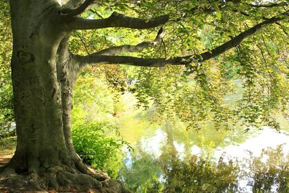 صفصاف مائل بجانب البحيرة ، انعكاس للخضرة في الماء
