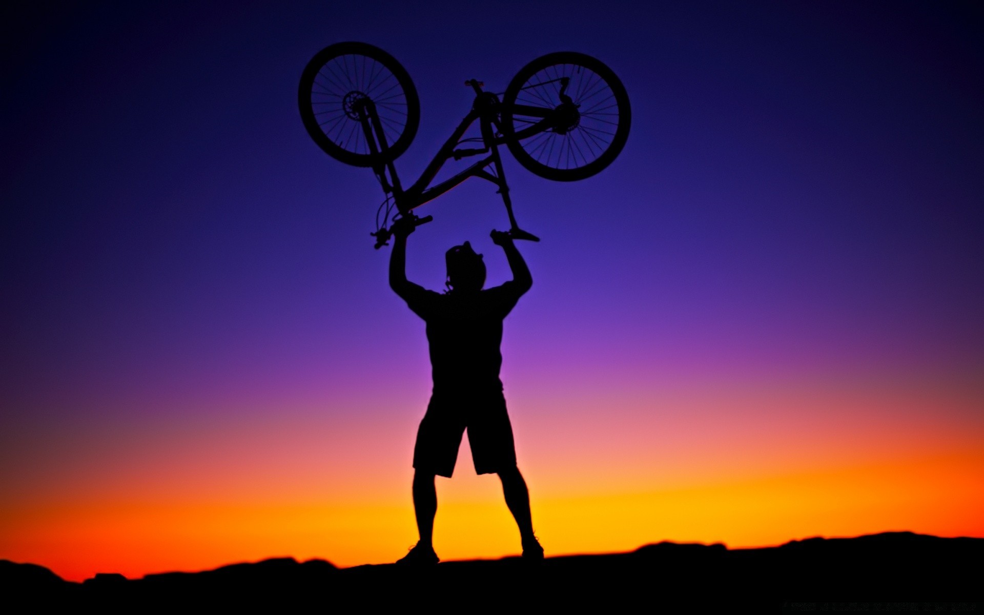 غروب الشمس ، يجبر الرجل على ركوب الدراجات