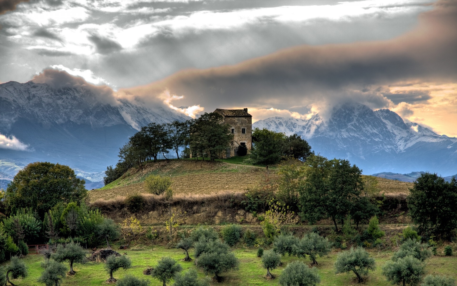 الغيوم العاصفة والأشجار ومنزل على تلة