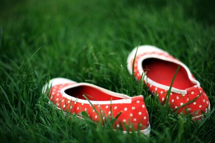 حذاء أحمر مع منقطة بيضاء على العشب الأخضر