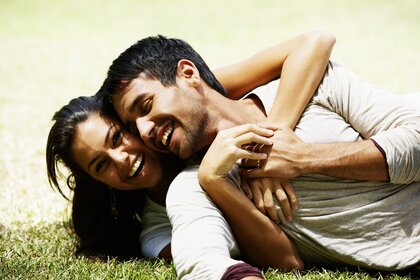 زوجان سعيدان يحتضنان على العشب