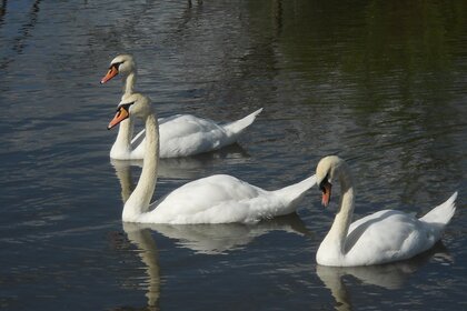 ثلاثة بجعات بيضاء تطفو على البحيرة