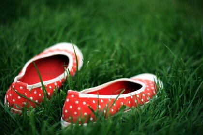نعال حمراء بنقاط بيضاء على العشب الأخضر