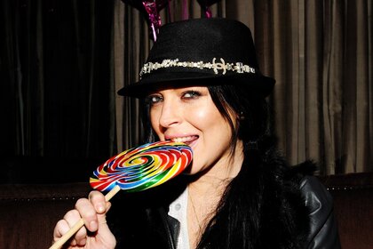 الفتاة في القبعة. الكرمل على عصا. فتاة مع الحلوى