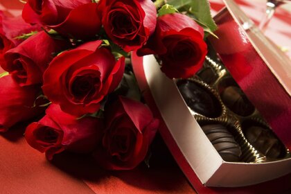 هدية رومانسية. الورود وعلبة من الشوكولاتة