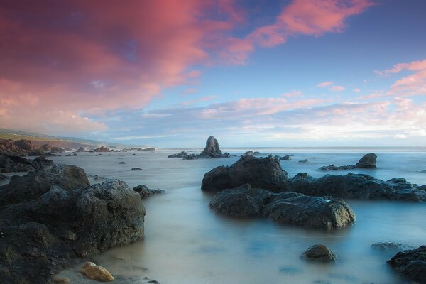 ينعكس غروب الشمس الذهبي في مياه البحر