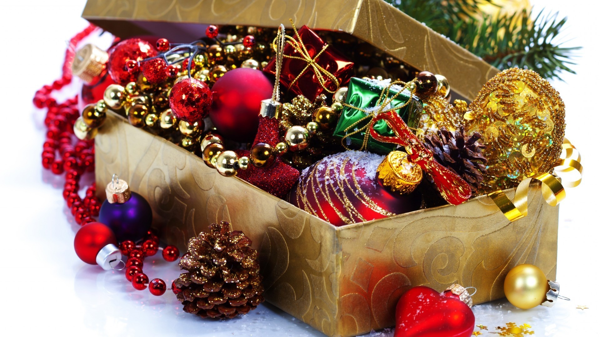 صندوق مليء بألعاب عيد الميلاد المختلفة - خلفيات سطح المكتب